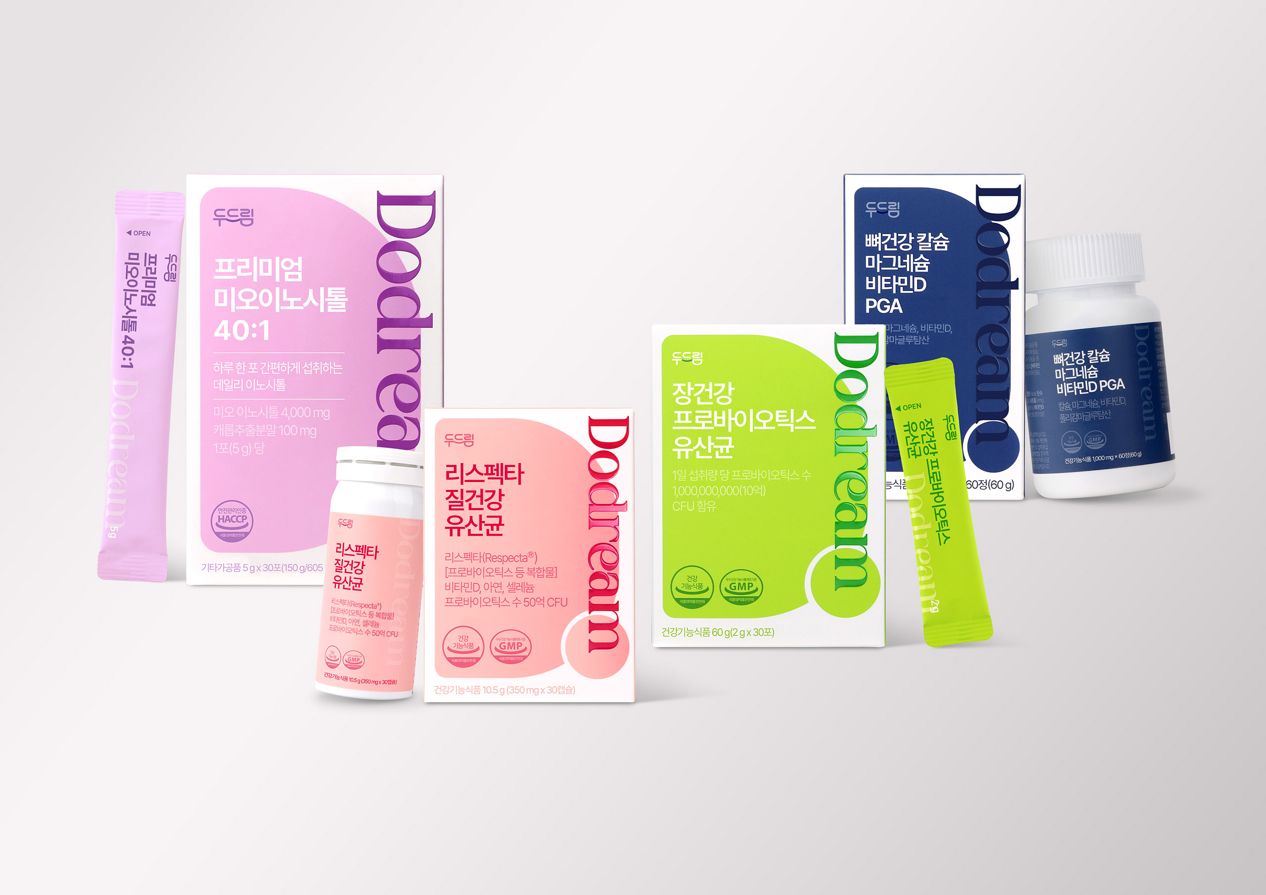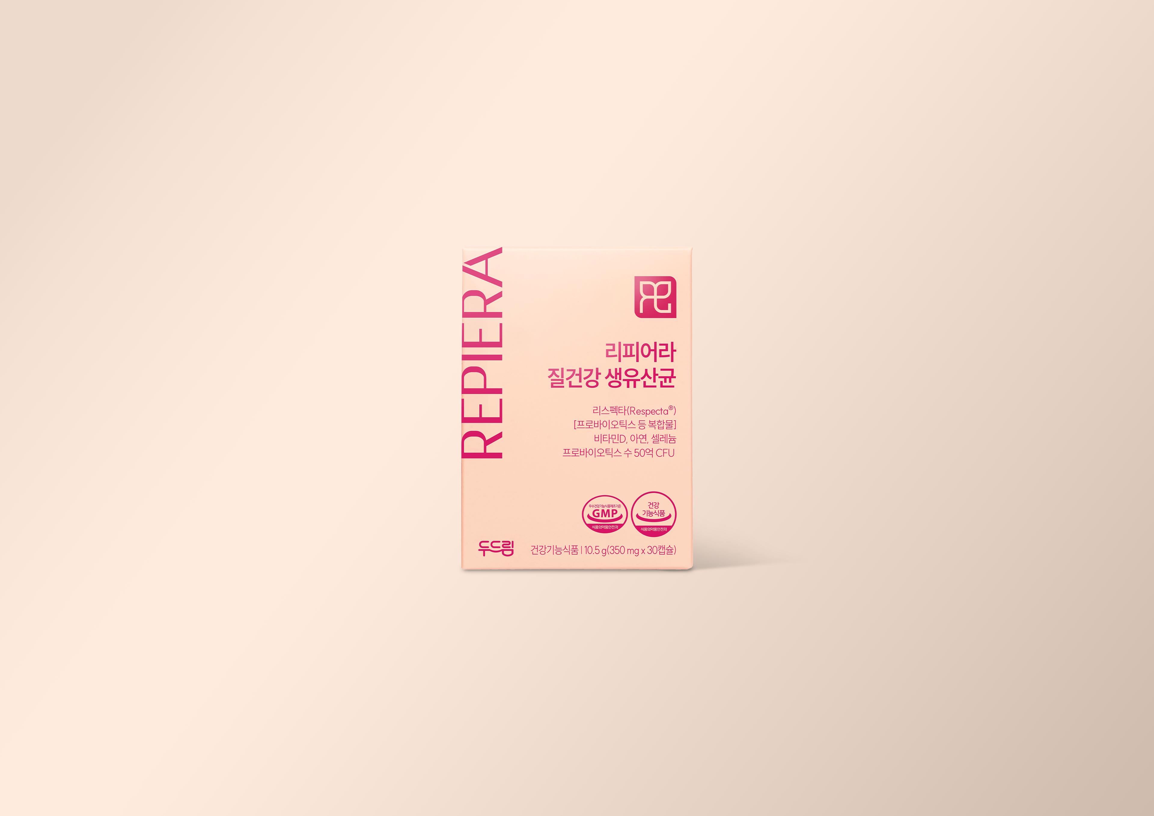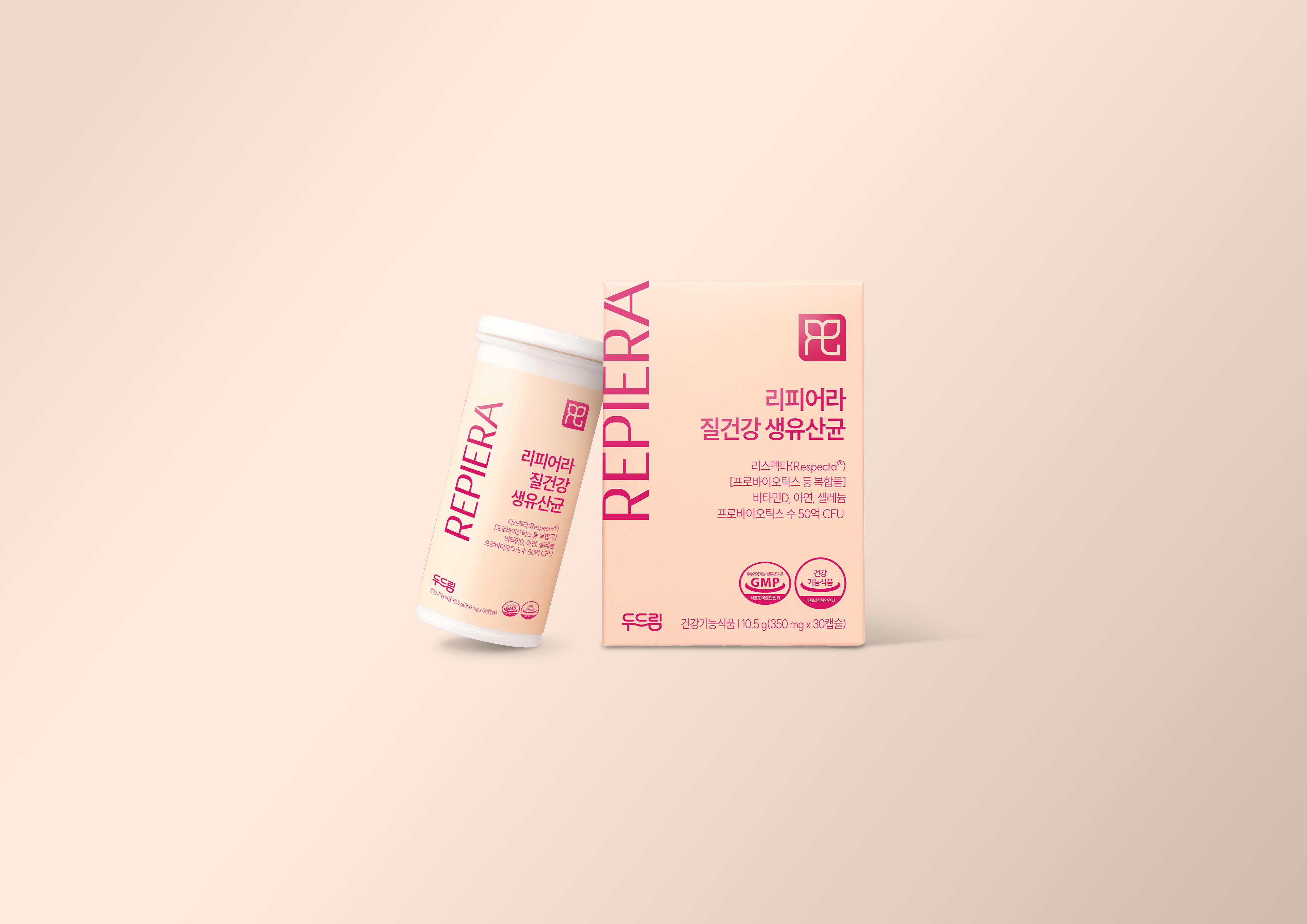 여성의 내면적 건강과 자신감을 상징하는 부드러운 피치 핑크를 메인 컬러로 활용하여 심리적 안정감과 건강한 생기를 시각화했습니다. 미니멀한 타이포그래피와 정갈한 레이아웃으로 기능성 원료(Respecta)에 대한 전문적인 브랜딩을 구축했으며, 건강기능식품의 신뢰도와 라이프스타일의 감성을 조화시킨 디자인입니다.