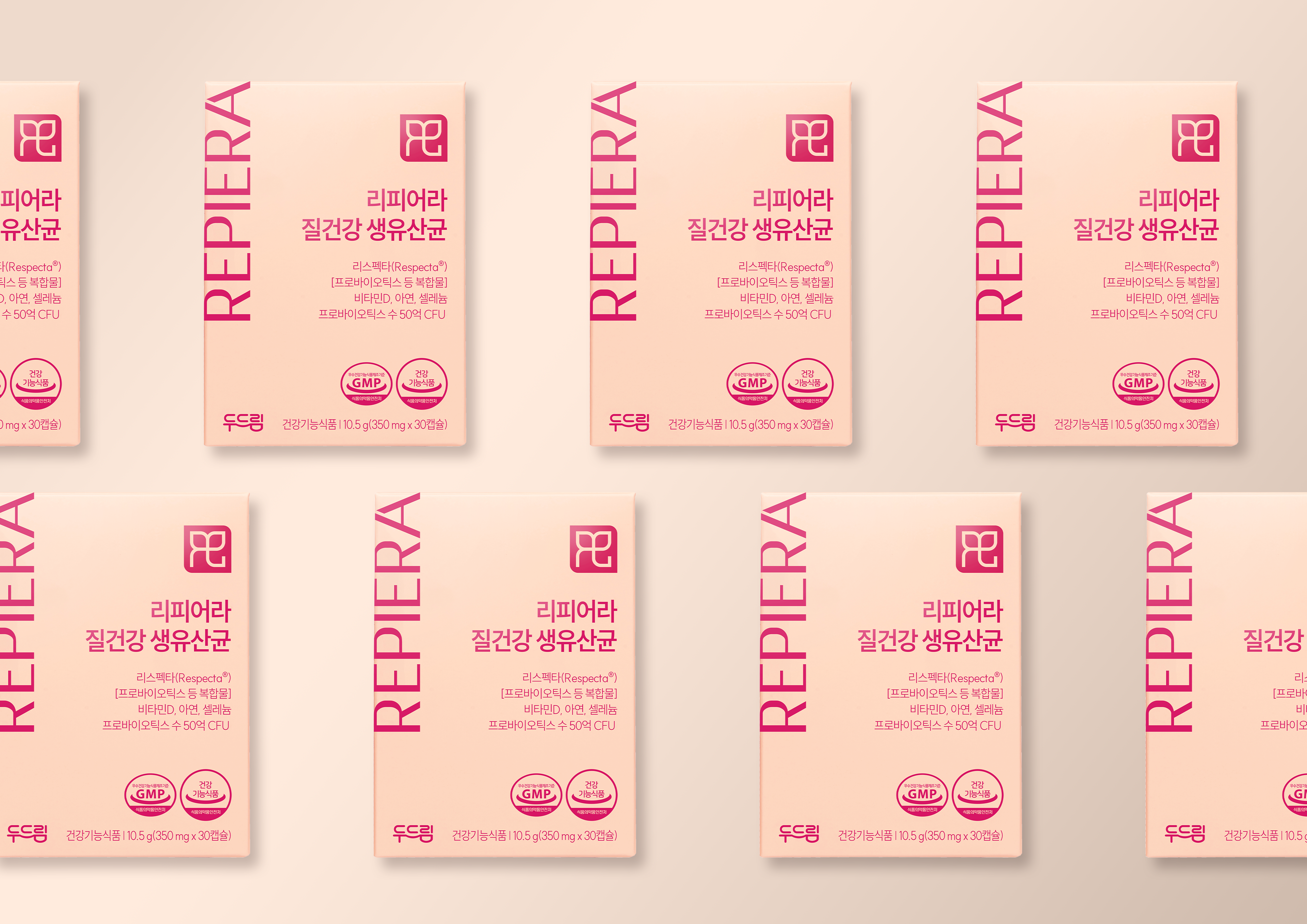 여성의 아름다움을 지키는 '리피어라'의 브랜드 철학을 화사하고 따뜻한 파스텔 톤의 컬러 팔레트로 표현하여 브랜드 친밀도를 높였습니다. 패키지 전면의 직선적인 로고 배치와 여백의 미를 통해 세련된 인상을 주었으며, 휴대용 용기와의 시각적 통일감으로 브랜드 아이덴티티를 강화했습니다. 기능적 설명을 넘어 감각적인 비주얼로 타겟의 소유욕을 자극하는 감성 마케팅 관점의 디자인 프로세스를 담았습니다.