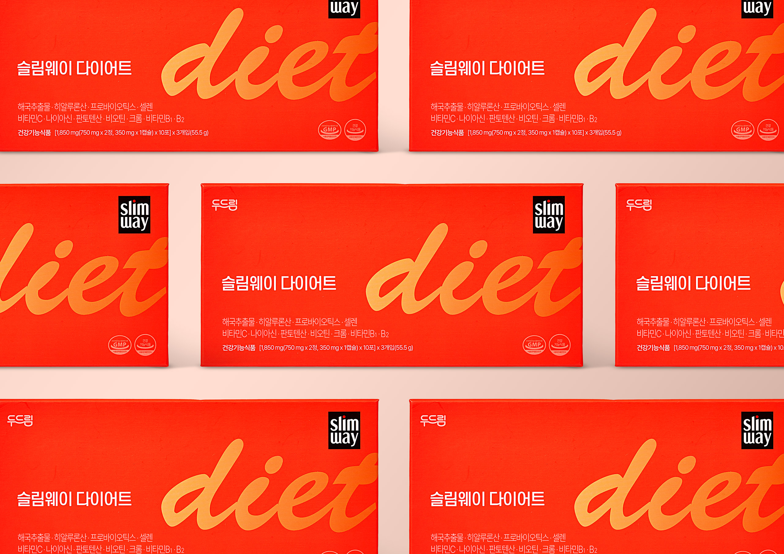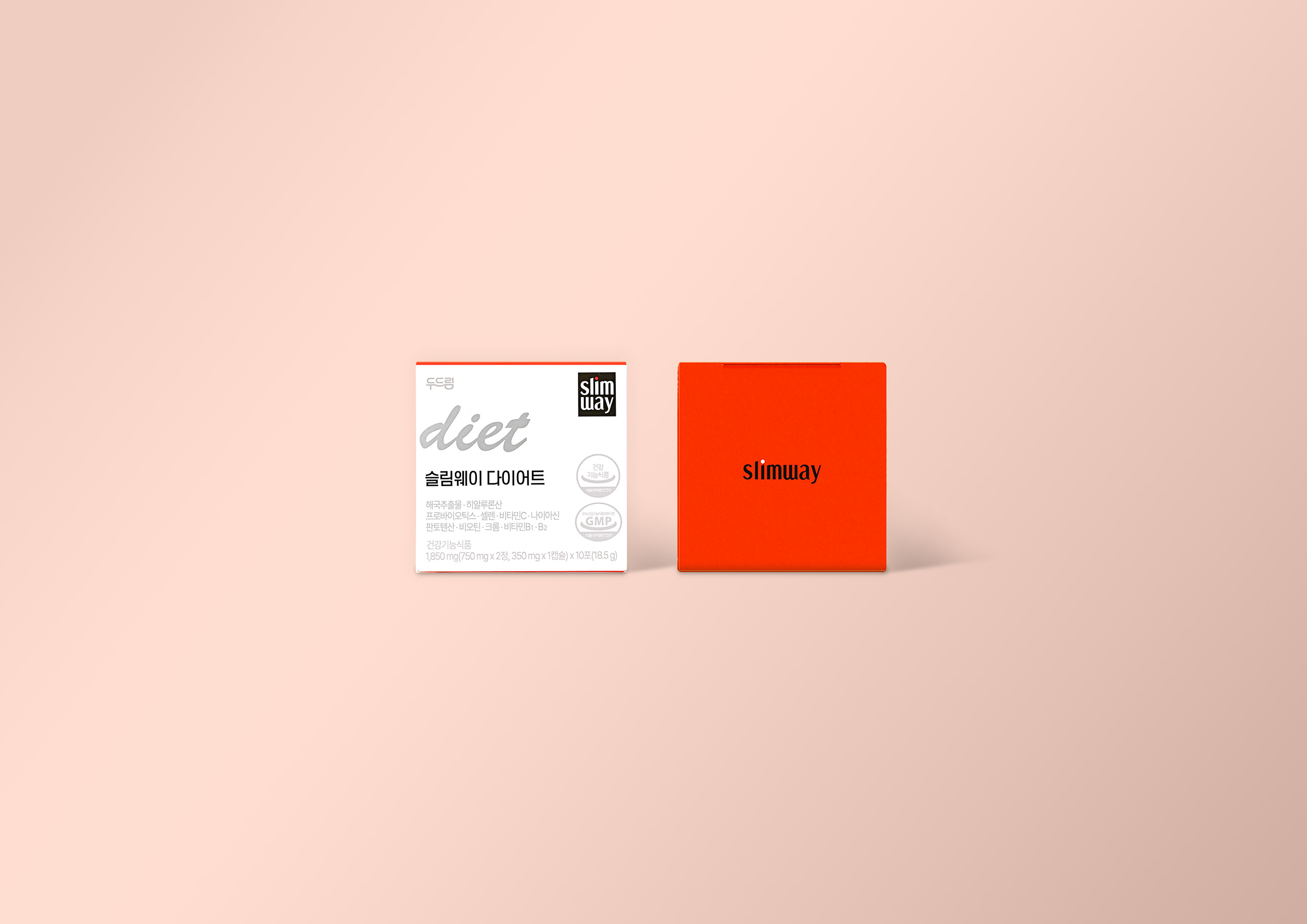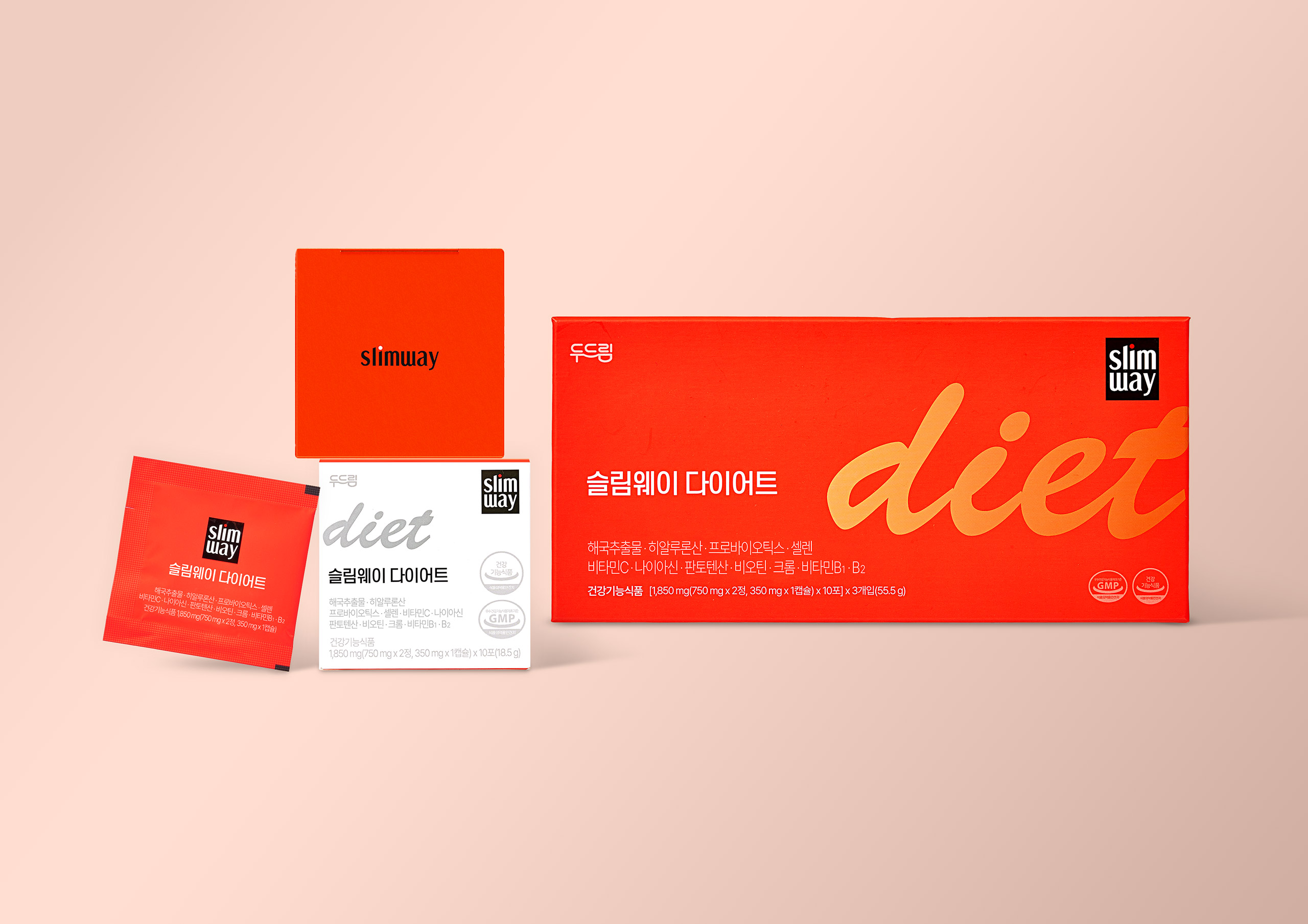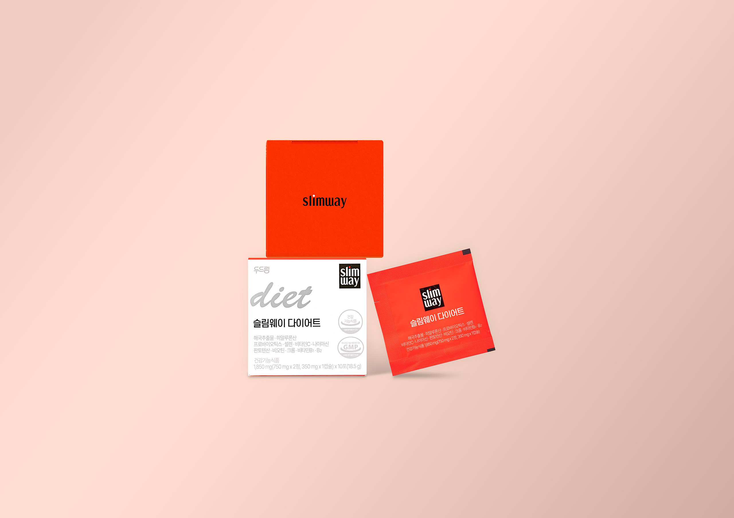 슬림웨이는 여성들이 ‘무리한 다이어트’보다 건강한 체중 관리에 관심을 가지기 시작한 시점에 맞춰 “꾸준히, 나답게”라는 메시지를 담고 탄생했습니다. 패키지는 책상 위나 가방 속에서도 ‘나를 챙기는 습관’으로 느껴지길 바라는 감성적 오브젝트로 디자인되었습니다. 다이어트 보조제의 심리적 장벽을 낮추고 세련된 라이프스타일 아이템으로 인식되도록 유도하는 감성 마케팅 관점의 패키지 디자인입니다.