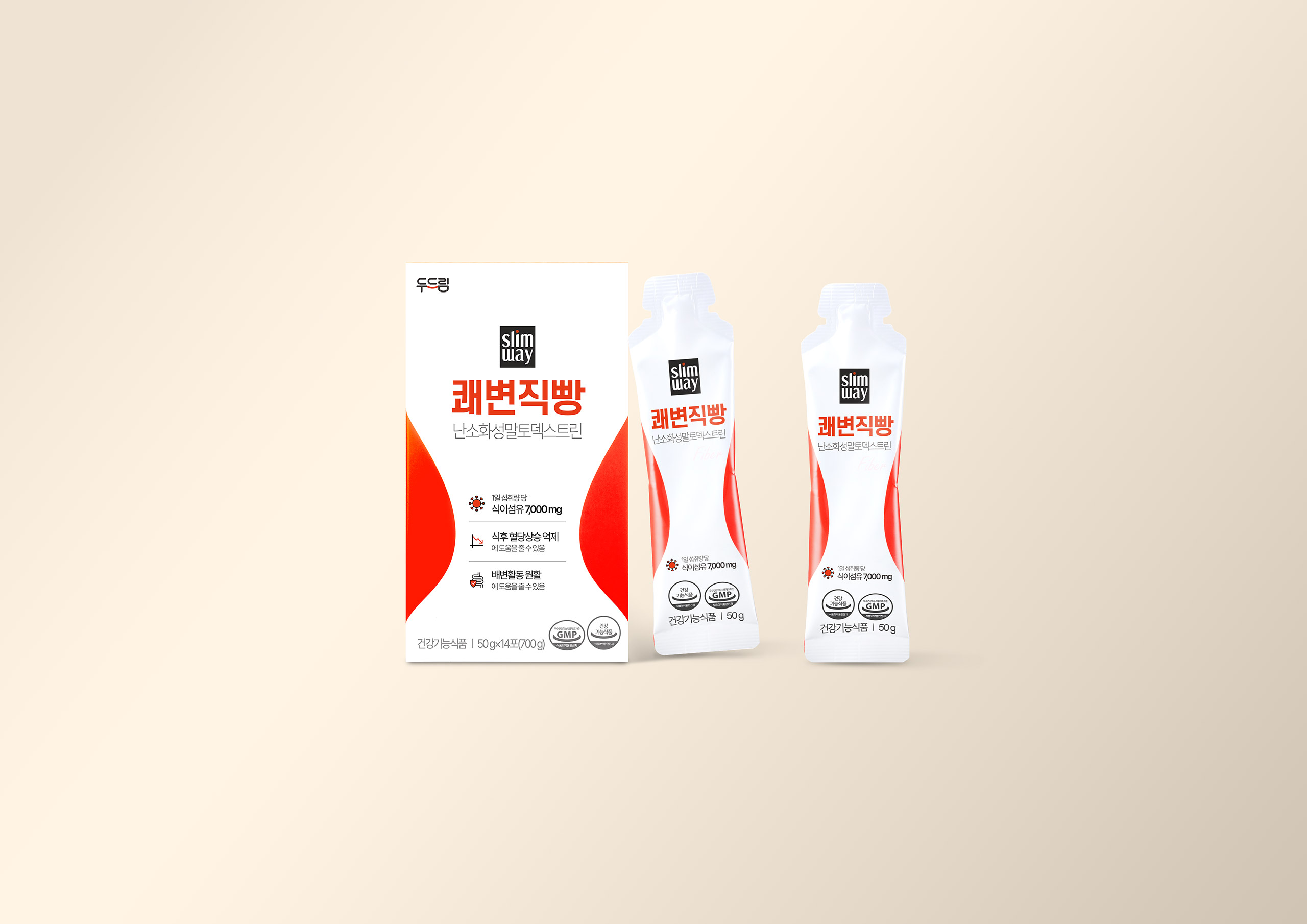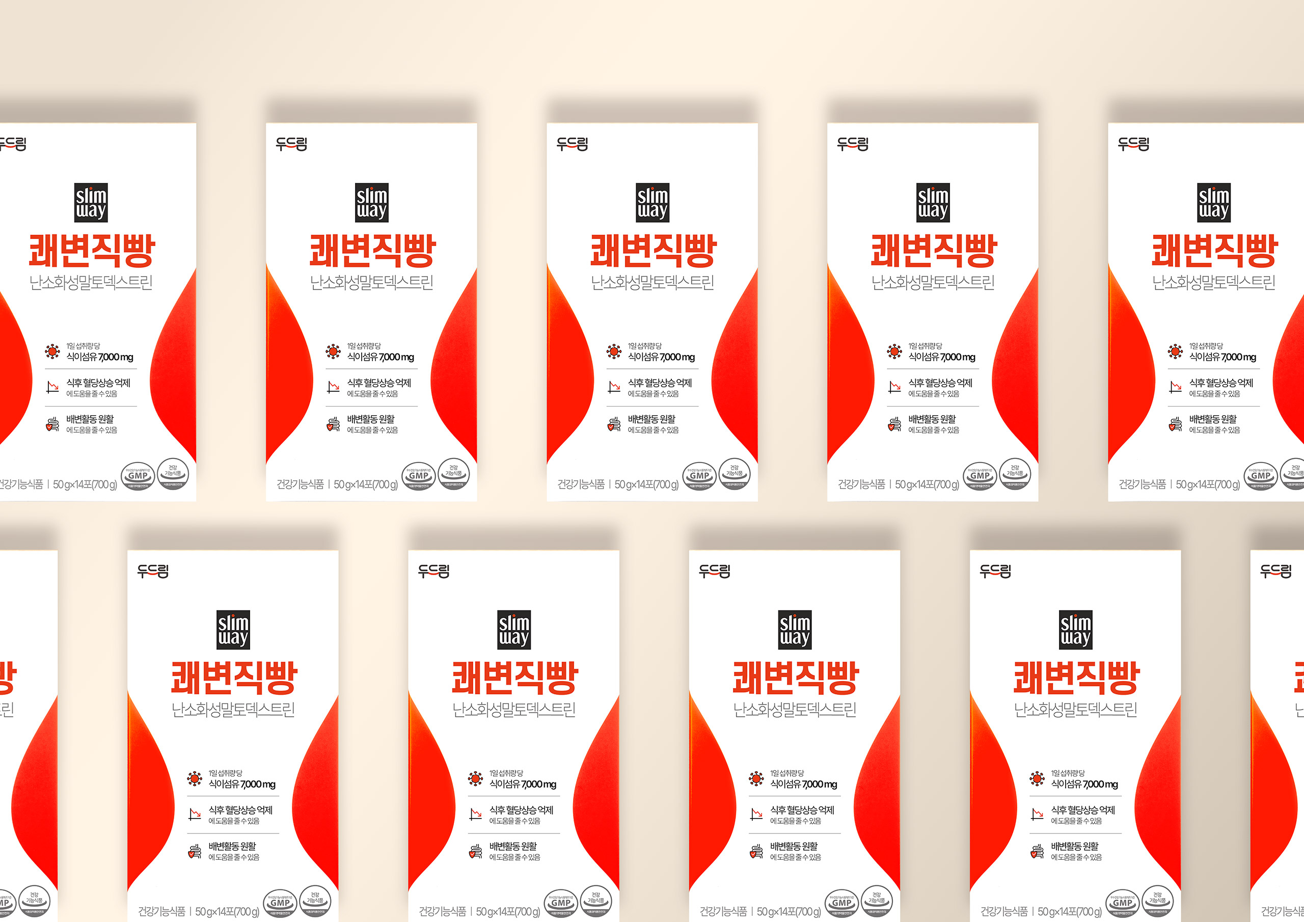 슬림웨이 라인업의 일관된 브랜드 시스템 안에서 '쾌변'이라는 제품의 특장점을 명확하게 하기 위해 역동적인 붉은 사선 그래픽을 핵심 요소로 설계했습니다. 건강한 원료(매실)를 연상시키는 그린 포인트와 레드의 보색 대비를 통해 생동감을 더했습니다. 제품의 기능인 장의 움직임이나 원활한 배출을 시각적으로 구현하기위해 시각적 리듬감으로 표현하여 소비자에게 기분 좋은 변화를 연상시키고, 브랜드에 대한 긍정적인 경험을 유도하는 스토리텔링형 디자인을 하였습니다.